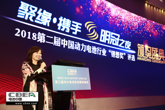 圖為動力電池應用分會秘書長張雨在明冠之夜 2018第二屆中國動力電池行業“鋰想獎”頒獎盛典上致辭