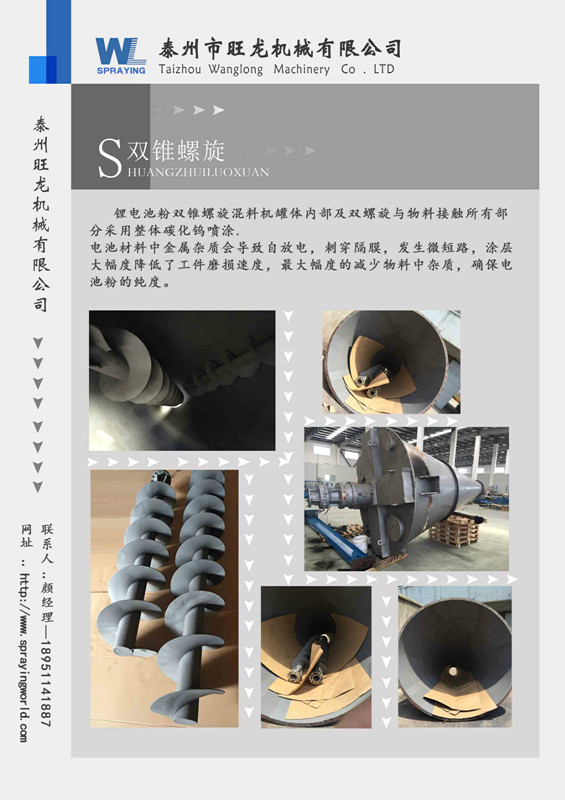 鋰電池粉雙錐螺旋混料機罐體內部及雙螺旋與物料接觸所有部分采用整體碳化鎢噴涂.