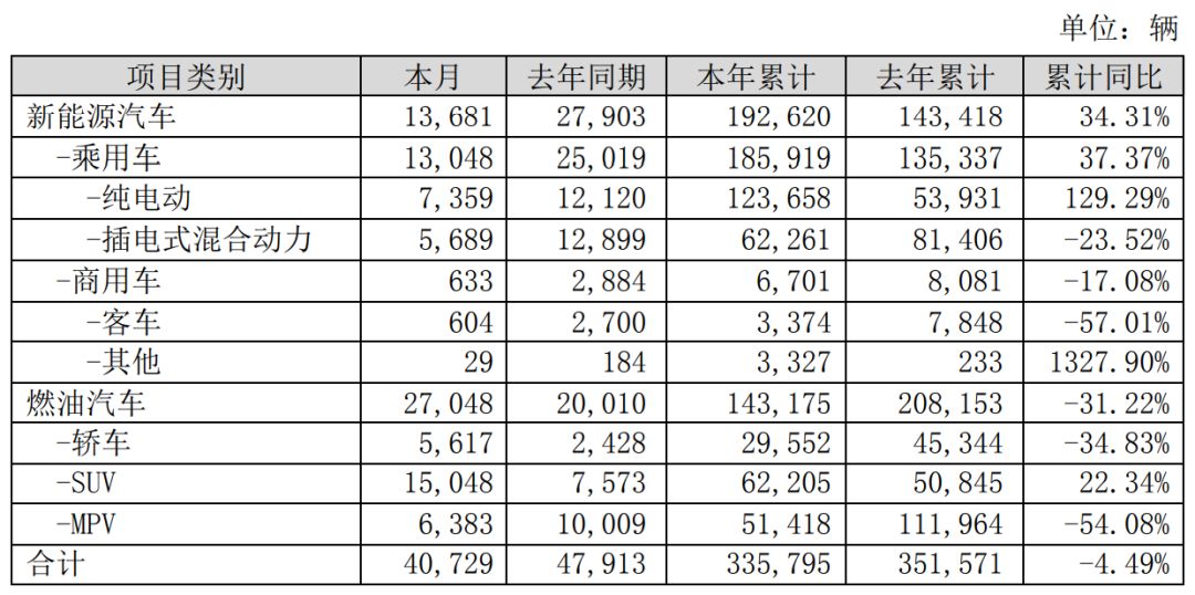 作為國內重要的整車企業,汽車業務對比亞迪業績影響重大,在比亞迪此前發布的9月銷量快報中顯示,2019年前三季度,比亞迪累計銷售新能源汽車192620輛,今年前三季度的銷量已經比去年全年銷量增加了34.31%。其中,純電動乘用車累計銷售123658輛,比去年全年的53931輛增長了129.29%。而比亞迪插電式混合動力車、新能源客車、燃油轎車、MPV累計銷量均出現不同程度的下滑。