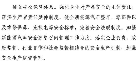《征求意見稿》提出,強化企業(yè)對產(chǎn)品安全的主體責任,落實生產(chǎn)者責任延伸制度。健全新能源汽車整車、零部件以及維修保養(yǎng)、充換電等安全標準,完善安全法規(guī)制度。加強新能源汽車安全隱患召回管理工作力度。落實企業(yè)負責、政府監(jiān)管、行業(yè)自律和社會監(jiān)督相結合的安全生產(chǎn)機制,加強安全生產(chǎn)監(jiān)督管理。