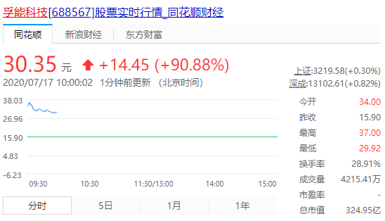 7月17日,孚能科技在上海證券交易所科創(chuàng)板上市(股票代碼:688567),成為科創(chuàng)板新能源汽車動(dòng)力電池第一股,同時(shí)也是中國(guó)新能源汽車軟包動(dòng)力電池第一股。截至17日上午10時(shí),孚能科技股價(jià)大漲90.88%,報(bào)30.35元,總市值達(dá)324.95億元。