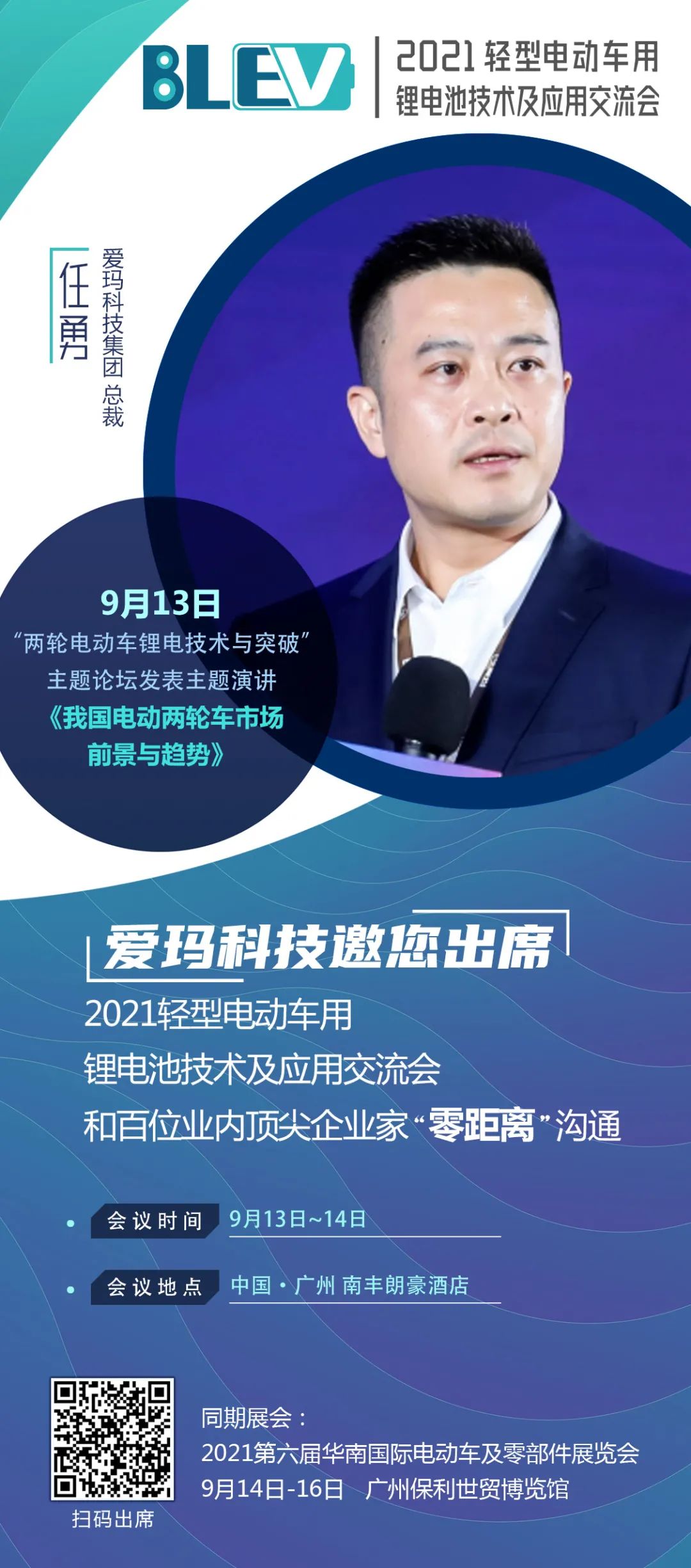 9月13-14日,愛瑪科技集團股份有限公司總裁任勇,將應邀出席“2021輕型電動車用鋰電池技術及應用交流會”,并發表關于“我國電動兩輪車市場前景與趨勢”的主題演講,敬請期待。