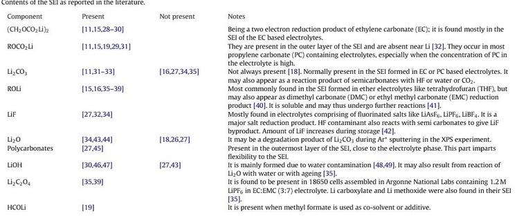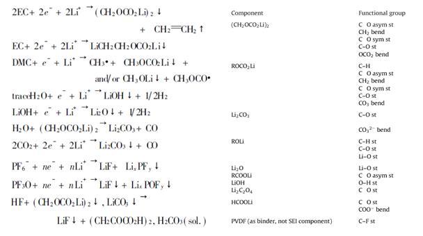 在形成過程中,發(fā)生了如下反應(yīng),生成了LiCO3、(CH2OCO2Li)2等無機/有機沉淀物、也生成了H2、C2H4等氣體分子。下表列出了一些常見組成成分。對于其中成分的分析,主要依靠FITR(紅外)和XPS(X射線光電子能譜分析),分別得到成分和結(jié)構(gòu)信息。