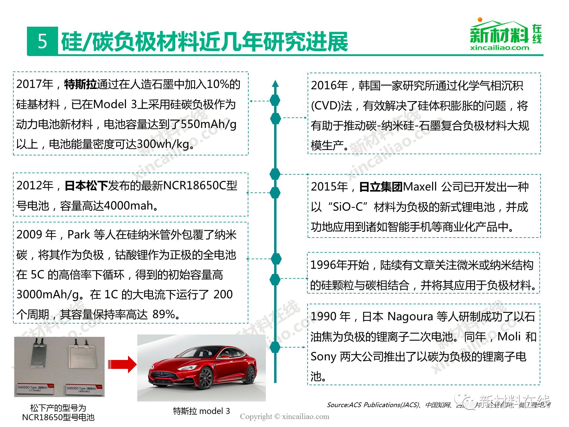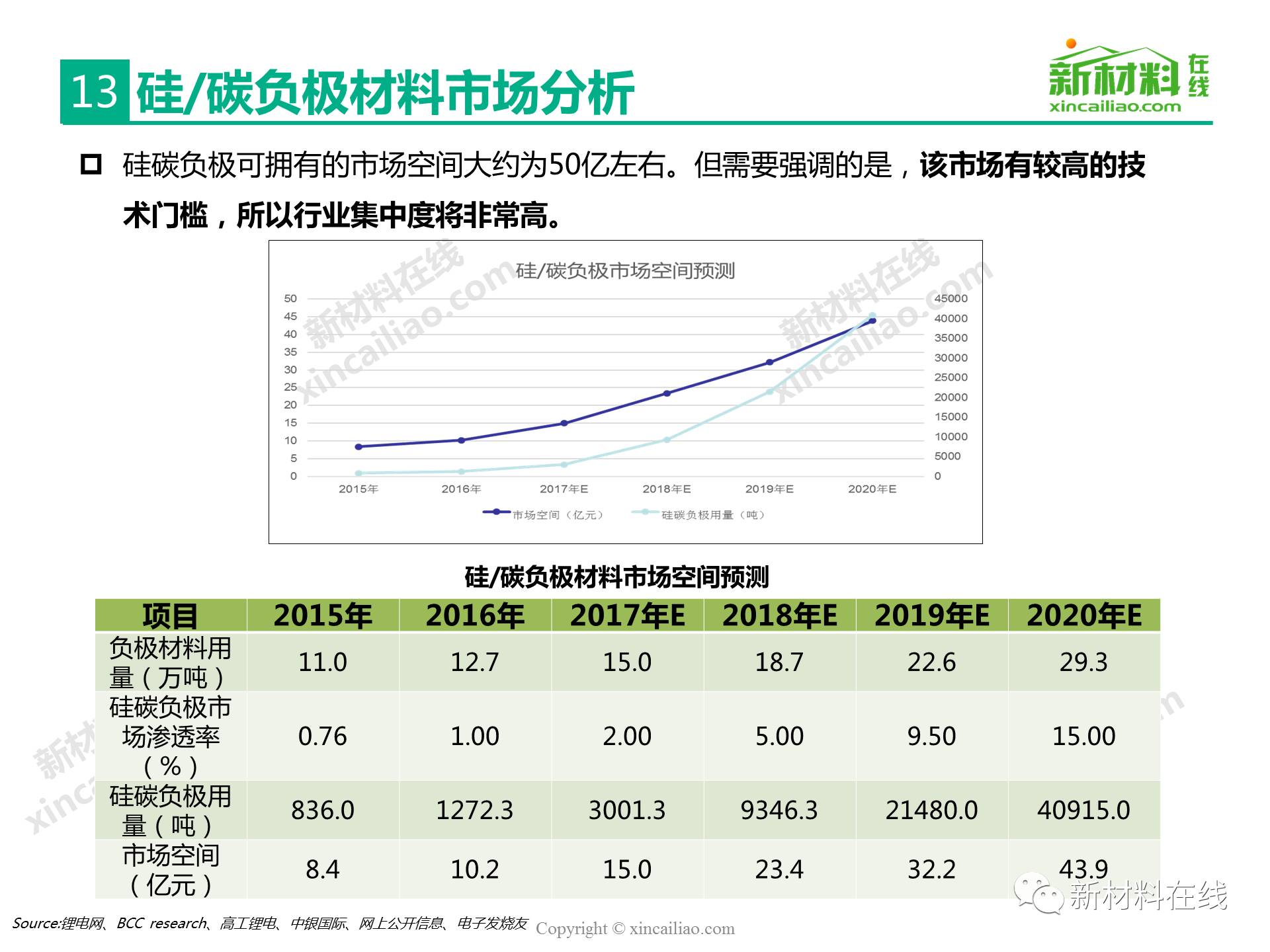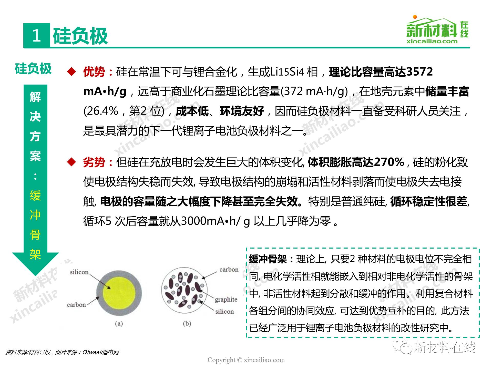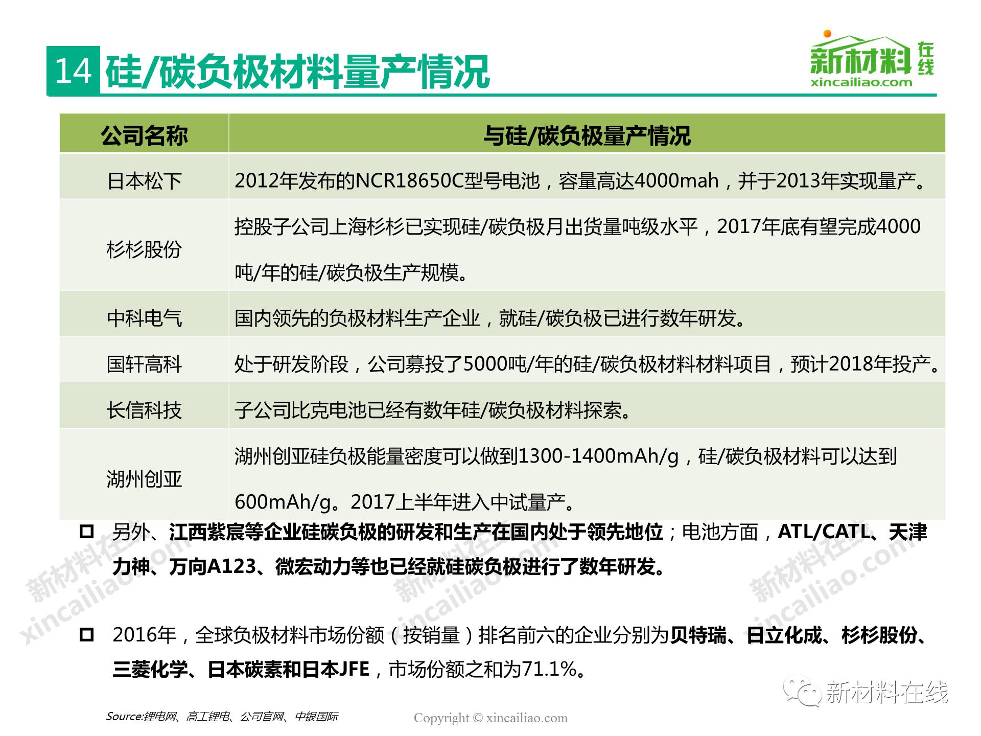 目前鋰離子電池負極材料主要包括石墨碳、硅的復合物、錫與碳的復合物、鈦氧化物、金屬鋰等,主要的性能指標比較如表16所示,其中,硅/錫/碳、金屬鋰的比容量相對于石墨實現了質的提升,將是未來高比能鋰電的新選擇,而鈦氧化物(鈦酸鋰材料)主要提高循環及快充性能。本文主要呈現的是2017全球硅碳負極材料研究報告。