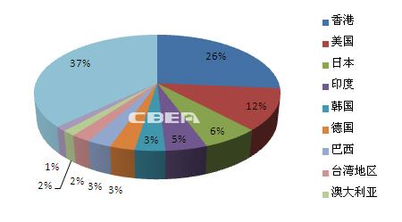 香港是我國電池行業最大的轉口貿易地,2013年我國內地向香港地區的出口金額達到了25.33億美元,占2013年中國電池總出口額的26.4%。