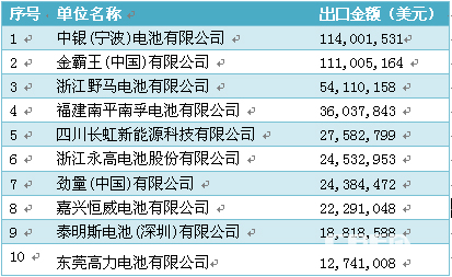2013年,我國圓柱堿錳電池前十大出口企業分別為中銀(寧波)電池有限公司、金霸王(中國)有限公司、浙江野馬電池有限公司、福建南平南孚電池有限公司、四川長虹新能源科技有限公司、浙江永高電池股份有限公司、勁量(中國)有限公司、嘉興恒威電池有限公司、泰明斯電池(深圳)有限公司、東莞高力電池有限公司,這十大企業共實現出口金額445,505,564美元。