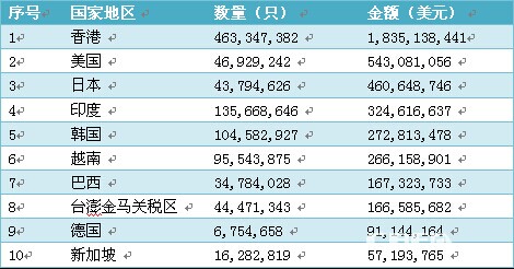 2013年,我國鋰離子電池出口的前十大國家和地區中,出口香港地區的總量和金額均排名第一,出口量達到了463,347,382只,出口總金額達到1,835,138,441美元。