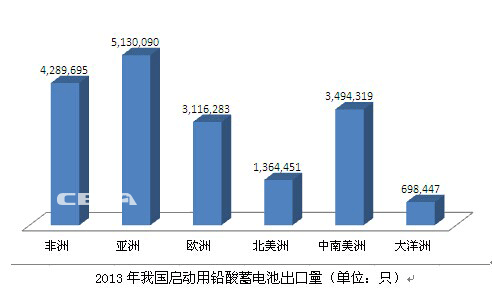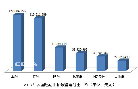 2013年,我國啟動用鉛酸蓄電池出口額為3.82億美元,而2012年出口額為3.78億美元, 同比增長 1%。其中,出口非洲的金額同比增長4.4%,出口亞洲同比增長43.7%,出口歐洲減少31.9%,出口北美減少6.7%,出口中南美洲同比減少25%。