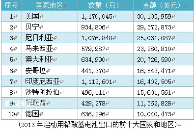 2013年,我國啟動用鉛酸蓄電池出口的前十大國家和地區為美國、貝寧、尼日利亞、馬來西亞、澳大利亞、安哥拉、印度尼西亞、沙特阿拉伯、阿聯酋、德國。其中,對美國的出口量和出口金額均為最高,共計向美國出口啟動用鉛酸蓄電池1,170,045只,出口金額30,105,959美元。