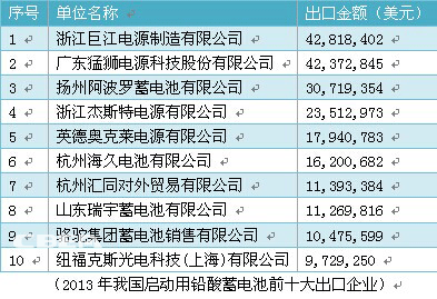 2013年,浙江巨江電源制造有限公司啟動用鉛酸電池出口額最高,達到42,818,402美元,廣東猛獅電源科技股份有限公司以42,372,845美元的出口額排名第二。排名前十的企業總計出口額達到了216,433,088美元。