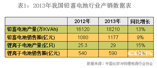 據中國化學與物理電源行業協會統計,2013年我國鉛蓄電池的總產量為18210萬KVAh,較2012年的16120萬KVAh同比增長了13%,僅低于鋰離子電池15%的同比增長率,成為2013年產量增速第二的電池產品。同時,鉛蓄電池2013年度的銷售收入高達1177億元,遠高于鋰離子電池全年590億元的銷售額,成為電池行業名副其實的“老大”。