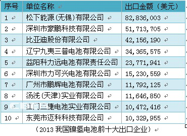 2013年,松下能源(無錫)有限公司、深圳市豪鵬科技有限公司、比亞迪股份有限公司等企業鎳氫電池出口量排在前三位,其中,排名首位的松下能源(無錫)有限公司出口額達到了82,836,003美元。