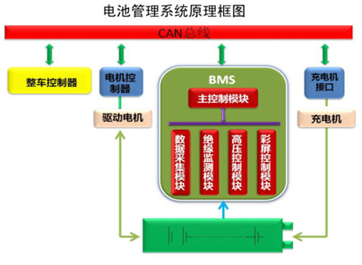 參照電池管理系統(BMS)原理框圖,中間綠色部分是BMS主控制模塊,包括數據采集模塊,絕緣檢測模塊,高壓控制模塊,彩屏控制模塊。中控制模塊只是一個檢測單元,并不等同于BMS。完整的BMS所起的作用包括與整車控制器、電機控制器、充電機接口、驅動電機、充電機相結合。