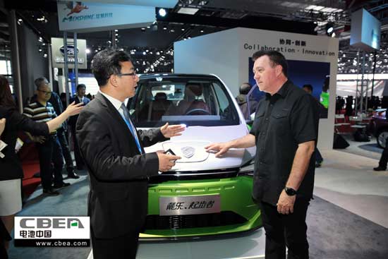 猛獅科技副總裁王亞波(左)向國外客商介紹"戴樂•起步者"純電動(dòng)汽車