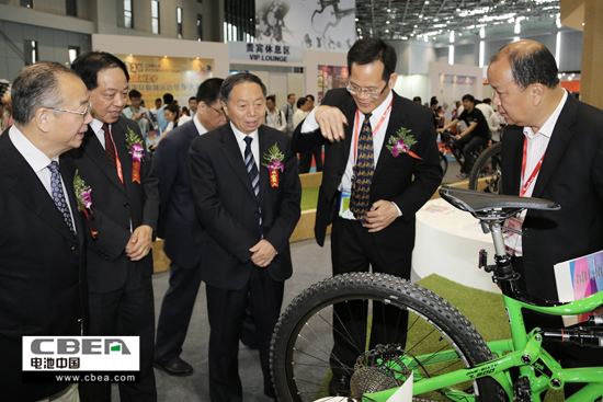 中國輕工業(yè)聯(lián)合會會長步正發(fā)(左三)和中國自行車協(xié)會理事長馬中超(左二)等在展臺參觀