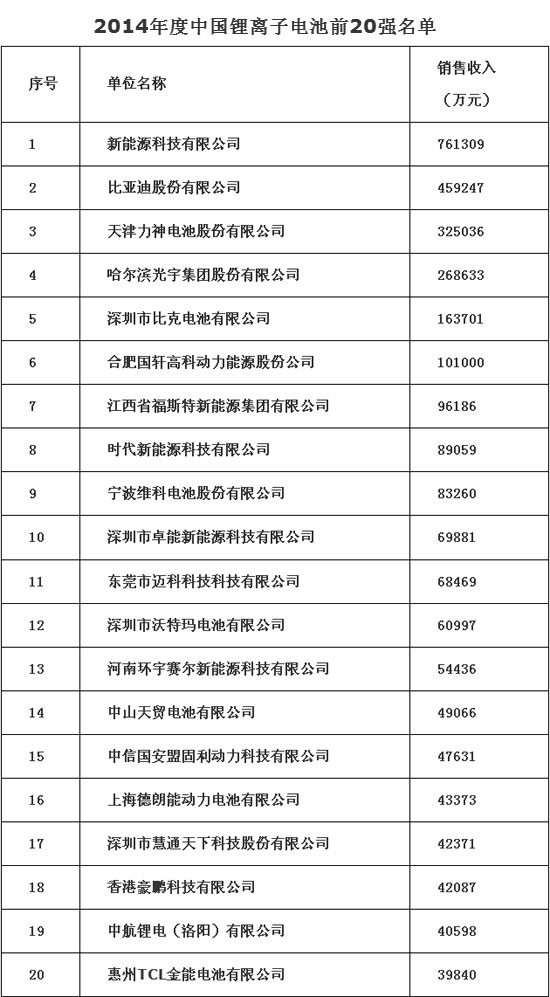 近日,中國化學與物理電源行業協會發布我國“2014年度鋰電行業20強企業名單”。新能源科技有限公司、比亞迪股份有限公司、天津力神電池股份有限公司分列該榜單的前三位。