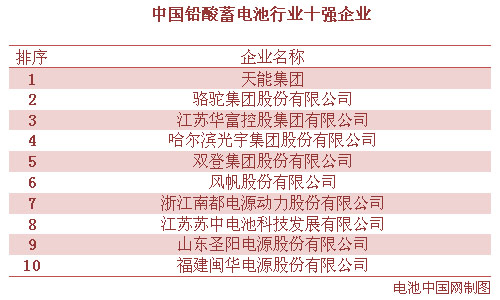 日前,中國輕工業(yè)聯(lián)合會(huì)發(fā)布2014年度中國鉛酸蓄電池行業(yè)十強(qiáng)企業(yè)榜。該榜單由中國電池協(xié)會(huì)推薦,由中國輕工業(yè)聯(lián)合會(huì)對(duì)參評(píng)企業(yè)2014年度主營業(yè)務(wù)收入、利潤等指標(biāo)進(jìn)行綜合評(píng)定得出。