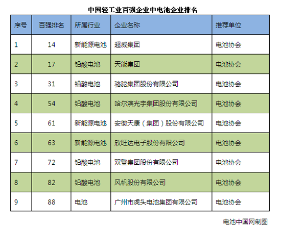 2014年度中國輕工業百強企業榜之電池企業榜單