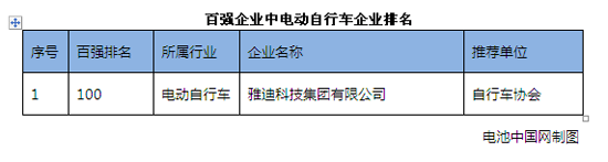 [摘要]日前,中國輕工業聯合會發布2014年度中國輕工業百強企業榜。其中,百強企業中電池企業和電動自行車企業名單如下表。