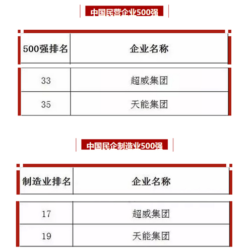 繼以第198名和第211名的成績上榜由中國企業聯合會、中國企業家協會發布的“2015中國企業500強榜單”后,浙江民企超威集團和天能集團又分別以第33名和第35名的優異成績榮登“2015中國民營企業500強”榜單。同時,在“中國民企制造業500強”中,超威集團、天能集團分別排名17、19,成為民企制造業中電池行業的杰出代表。
