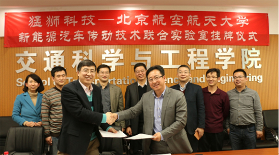 [摘要]3月11日,猛獅科技與北京航空航天大學交通科學與工程學院(以下簡稱北航交通學院)聯合成立的“新能源汽車傳動技術聯合實驗室”(簡稱“聯合實驗室”)在北京航空航天大學工程訓練中心舉行掛牌儀式。