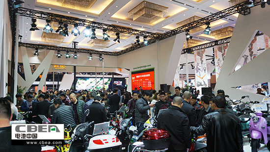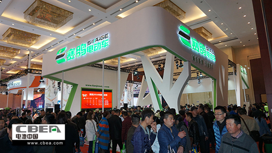 圖為賽鴿電動車展位現(xiàn)場人氣火爆