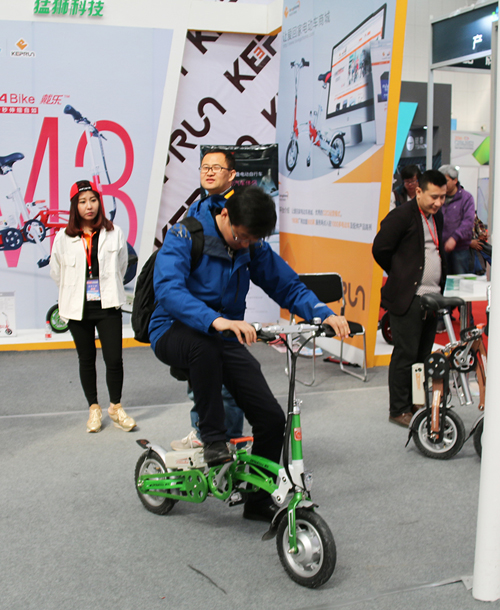 圖為展會(huì)現(xiàn)場(chǎng)觀眾試騎M3鎂合金智能折疊電動(dòng)自行車