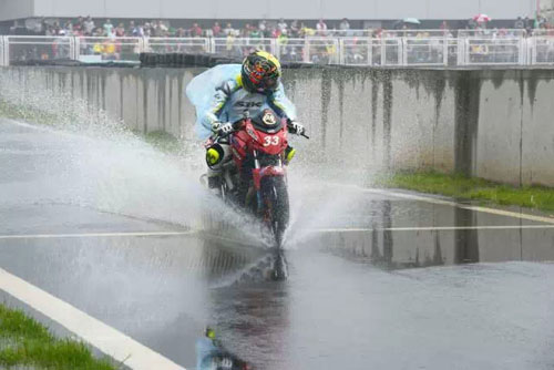 作為本年度的首場比賽,各路車隊有足夠的時間備戰。怎奈天公不美,2號上午下起大雨來,使得原本10點開始的練習賽推遲了半小時,早已整裝待發的眾車手隨著裁判一聲哨響,如脫僵野馬般沖入賽道。由于賽道積水,沖在最前面的車手賽車打滑,摔倒在地,人車前后相繼滑出十米遠,激起一幕水墻,車手在人群的驚呼聲中扶起摩托,揚長而去,留下一串水花和一個瀟灑的背影,觀眾轉而歡呼鼓掌相送。后來,車手們索性任性的玩起水來,大有比賽看誰水花濺得高濺得帥之勢。