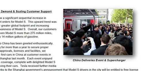 上個月,特斯拉在中國完成了首次交車。中國市場也成為了特斯拉未來發展的重要基石。在“致股東信”上,馬斯克本人在北京交車的圖片被放在了第一頁的顯著位置上。在問答環節中,馬斯克表示中國人對特斯拉的熱情超出了他的預期,全社會各個層面都對特斯拉顯示出了極大的興趣,馬斯克也對特斯拉在中國的發展充滿信心。不過他也意識到,現在急需解決的問題不是市場需求,而是如何減少車主的等待時間。目前特斯拉的周產量約為700輛。到2014年底,特斯拉希望將產能提升至1000輛/周。另外,今年特斯拉將著重渠道建設。到2014年底,特斯拉計劃將門店及服務中心的數量同比提高75%。
