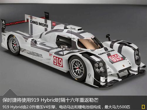 而在今年6月舉行的2014勒芒24小時耐力賽上,保時捷將使用全新開發的919 Hybrid賽車參加頂級參賽組LMP1的爭奪。919 Hybrid造型設計明顯傳承自保時捷 917 KH Coupe勒芒賽車,混動系統由一臺2.0升單渦輪增壓V4直噴汽油引擎,一臺前置的電動馬達和一個鋰電池組構成,其中V4引擎的轉速最高可以達到9,000rpm,最大馬力可達500匹。