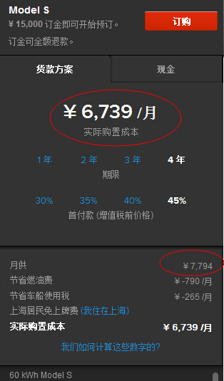 值得一提的是,特斯拉官網(wǎng)此次弱化了實際月供的顯示,而是突出了實際購置成本。以Model S 60千瓦時版本為例,按上述最少月供來計算,月供為7425元,然而特斯拉官網(wǎng)網(wǎng)頁上著重強調(diào)了6739元的使用成本,該數(shù)字為月供金額扣除燃油費及車船使用稅之后的金額。