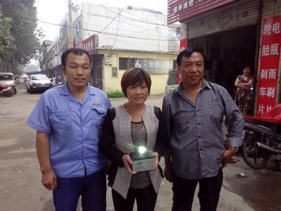 天能集團匯源電池代理商相其偉(右)、高吉電動車維修部老板高吉(左)、消費者高麗(中)三人合影