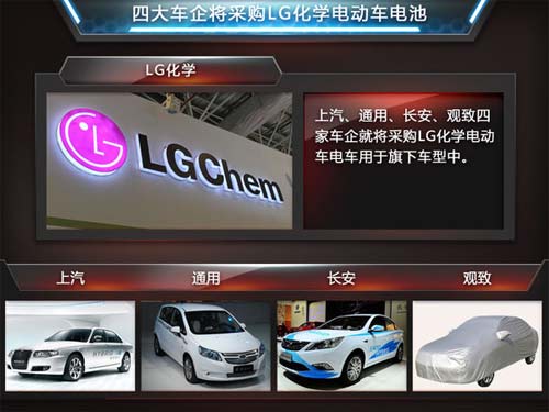 在國內LG已有一批電動車電池客戶,長安和通用此前曾采購LG化學電動車電池應用在旗下新能源車當中。近日,LG與又上汽和觀致達成供應協議,將為兩家車企提供電動車電池。未來上汽集團的插電式混動車以及觀致的新一代電動車都將采用LG化學公司生產的電池。加上之前的兩家車企LG化學在華汽車電池客戶已經達4家。LG化學方面透露:“4家車企目前訂單數已經超過10萬輛”。這將為LG化學帶來數億美元的營業收入。