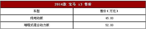 24日,寶馬中國正式公布了寶馬i3的售價,未來新車上市后將推出純電動版和增程式混合動力版兩款車型,售價分別為45.0萬元和52.0萬元。詳細售價請見下表: