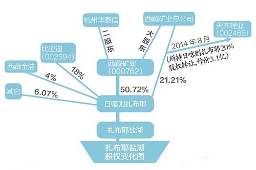 四年前,經由西藏地區招商引資和隨后的債務重組,比亞迪股份有限公司(股票代碼002594,下稱比亞迪)和西藏金浩投資有限公司(下稱西藏金浩),以近2.5億元現金參股日喀則扎布耶,分別持股18%和4%;剩下6.07的股權,則分散在中節能新材料投資有限公司等三家機構手中。