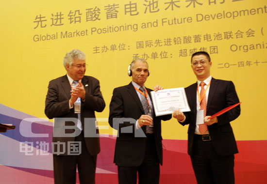 峰會上傳來了捷報,超威集團加入了國際先進鉛酸蓄電池聯(lián)合會,成為該聯(lián)合會的第十家中國成員單位。國際先進鉛酸蓄電池聯(lián)合會主席David Wilson(戴維•威爾森)向超威集團董事長周明明頒發(fā)了成員單位牌匾。