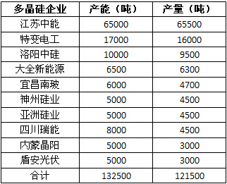 數據顯示,2014年,包括江蘇中能、特變電工、洛陽中硅、大全新能源、宜昌南玻、神州硅業、亞洲硅業、四川瑞能、內蒙晶陽、盾安光伏在內的十家主要多晶硅企業總產能達到132,500噸,總產量達到121,500噸。