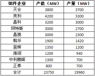 組件環節,天合、英利、晶科、阿特斯、晶澳、韓華、昱輝、海潤、中利騰暉、正泰等十家企業的總產能達到23,750MW,總產量達到19,960MW。