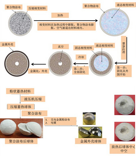 對于該儲熱球的制造和封裝工序,研究人員首先采用液壓機將這種粉狀相變蓄熱材料壓縮,然后用一種低成本、可硬化并具有高滲透率的聚合物涂布將壓縮后的相變材料包裹起來,再通過加熱工序,使相變材料膨脹,聚合物涂布膨脹將空氣逼出材料球內(nèi),形成真空。再通過放熱過程,相變材料在球體內(nèi)由外向內(nèi)冷卻成為固態(tài),因空氣在加熱過程中被逼出,中心部位形成真空狀態(tài),然后采用電鍍或高溫燒結(jié)技術(shù)將包裹起來的相變儲熱球封裝一層金屬外殼或者陶瓷外殼。(見圖1)