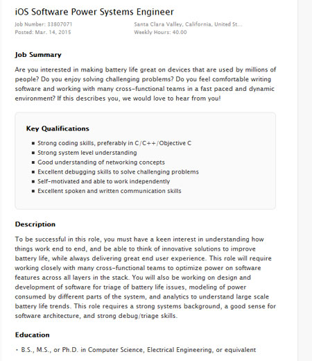 根據長期關注蘋果動態的美國科技新聞網站Appleinsider報道,在三月份公布的招聘崗位中,至少有九個和電池技術有關,比如硬件經理、固件開發經理、電池組工程經理、蓄電池單元工程師以及電氣工程師。