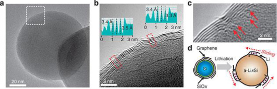 研究人員使用硅作為新型電池的陽極。硅是很好的電池陽極材料,硅陽極能夠比目前常見鋰電池所采用的石墨陽極容納更多的電量,但是硅在充電和放電過程中會產(chǎn)生明顯的體積變化——充電時硅的尺寸會增大,使用時卻會減少——這會損壞硅陽極,影響電池的性能。三星科研人員找到了克服此問題的辦法:研究人員將硅納米顆粒涂布在石墨烯層上;石墨烯具有優(yōu)異的導(dǎo)電和機械性能,可以讓硅納米顆粒左右滑動,并在需要時可以展開或收縮,確保硅材料具有它需要的所有空間。三星在實驗中在造出了能量密度為當(dāng)前普通手機電池1.5至1.8倍的電池。