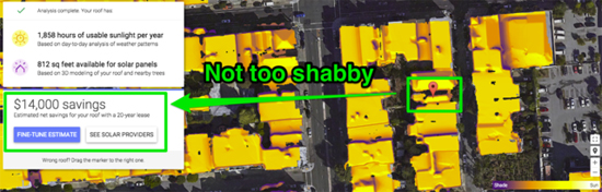 你可以看到自家屋頂全年的日光照射強(qiáng)度以及如果使用太陽能電池板一年可以節(jié)省多少電費開支。谷歌的工具在計算日光照射強(qiáng)度時參考了高分辨率航空測繪地圖和當(dāng)?shù)靥鞖獾纫蛩亍?/p>