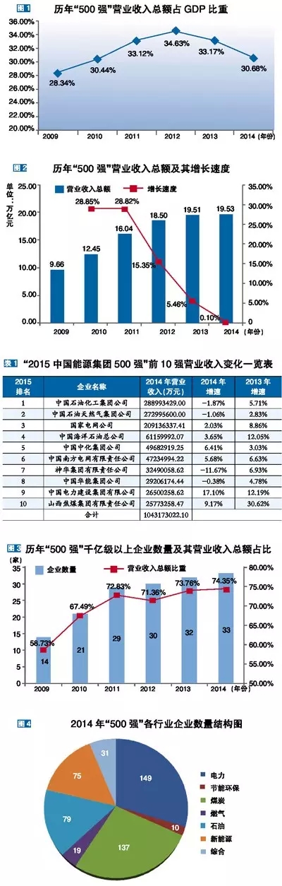“2015中國能源集團500強”總營業收入同比增長0.10%,增幅較上年回落4.36個百分點,為歷年增速最低。