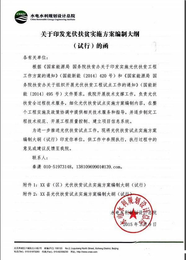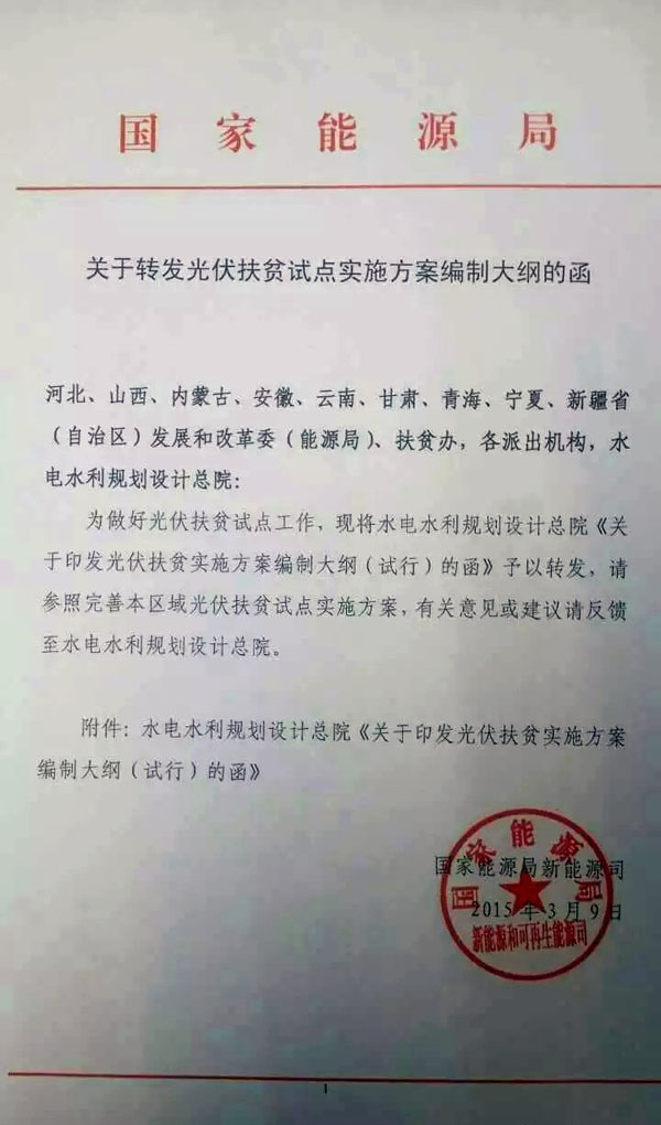 為持續(xù)推進(jìn)、完善光伏扶貧工作進(jìn)展,2015年3月9日,國家能源局新能源司下發(fā)《關(guān)于轉(zhuǎn)發(fā)光伏扶貧試點(diǎn)實(shí)施方案編制大綱的函》,為各地編制光伏扶貧實(shí)施方案提供參考依據(jù)。