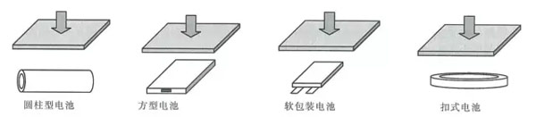 圓柱型電池?cái)D壓時使其縱軸向與兩平板平行,方形電池和軟包電池只對電池的寬面進(jìn)行擠壓試驗(yàn)。試驗(yàn)中電池放置方式參照圖示。一個樣品只做一次擠壓測試。