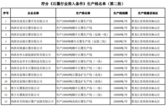根據《石墨行業準入條件》和《石墨行業準入公告管理暫行辦法》,經企業申報、省級工業和信息化主管部門核實、專家復核、網上公示和現場抽核,現將符合《石墨行業準入條件》生產線名單(第二批)予以公告。