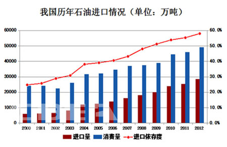 據統計,2012年我國石油總消費量約4.92億噸,對進口依賴度約59.2%。其中汽車用燃油占石油總消耗量的近60%。