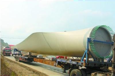2014年3月9日,湖南省隆回縣二橋橋頭,幾臺滿載風電設備的大卡車正駛往該縣白馬山。白馬山風電項目由中國水電顧問集團投資有限公司開發建設,總投資4.7億元,建成后,每年可為隆回縣提供1.1億千瓦時綠色電能。