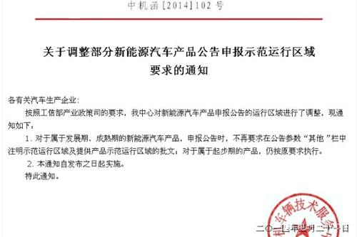 5月21日,中機車輛服務中心發布了《關于新能源汽車產品申報公告運行區域進行調整的通知》(以下簡稱《通知》)。該《通知》中提到,按照工信部產業政策司的要求,對于屬于發展期、成熟期的新能源汽車產品,在申報公告時,不再要求在公告參數“其他”欄中注明示范運行區域及提供產品示范運行區域,但對于屬于起步期的新能源汽車產品,仍按原要求執行。