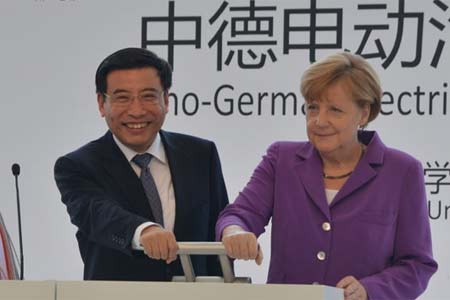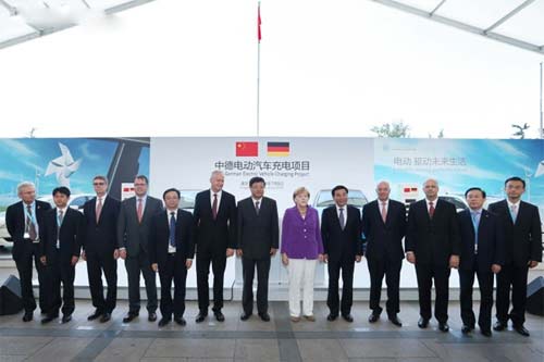 為這些電動車接通電力、注入能量的是德國總理默克爾和中國工信部部長苗圩。7月8日上午,清華大學主樓門前,中德電動汽車充電項目發(fā)布儀式在此舉行。默克爾和苗圩到場參加儀式,分別就電動汽車中德合作發(fā)表了看法,最后聯(lián)手拉下開關,為上述八輛電動汽車打開了充電開關。
